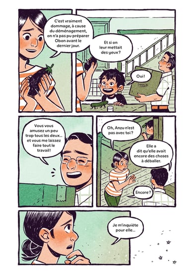 La BD s’ouvre sur un moment suspendu : Anzu, encore marquée par la mort de sa grand-mère, s’installe dans une nouvelle ville pendant Obon, cette période où les familles honorent leurs ancêtres. Mais la fête n’a plus la même saveur, le deuil a terni la magie.