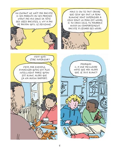 "Un enfant est curieux. Il pose beaucoup de questions et il attend des réponses précises et convaincantes. On ne triche pas avec les questions d’un enfant. C’est en m’accompagnant à une manifestation contre un projet de loi sur l’immigration que ma fille m’a interrogé sur le racisme. Nous avons beaucoup parlé. Les enfants sont mieux placés que quiconque pour comprendre qu’on ne naît pas raciste mais qu’on le devient. Parfois. Ce livre qui essaie de répondre aux questions de ma fille s’adresse aux enfants qui n’ont pas encore de préjugés et veulent comprendre."